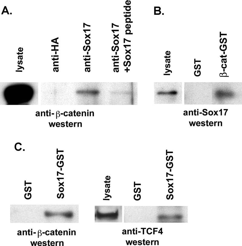 Figure 3. Endogenous Sox17, β-catenin, and TCF4 proteins interact in SW480 colon carcinoma cell lysates. (A) Sox17 antibodies were used to coimmunoprecipitate interacting proteins from nuclear extracts of SW480 cells. Lysates were immunoprecipitated with a control antibody (lane 1; anti-HA) or with a Sox17 antibody alone (lane 2) or in the presence of a Sox17 peptide or a control peptide (lanes 3 and 4). The Sox17 peptide used to generate the antibody inhibited the immunoprecipitation. (B) β-catenin (β-cat)-GST-linked beads or glutathione beads alone (GST) were incubated with cell lysates from SW480 cells, and precipitates were analyzed by Western blotting with an anti-Sox17 antibody. The Sox17 antibody was raised in rabbits and recognizes both mouse and human Sox17. (C) Sox17-GST beads or GST beads alone (GST) were incubated with cell lysates from SW480 cells, and precipitates were analyzed by Western blotting with anti β-catenin or anti-TCF4 antibodies. |