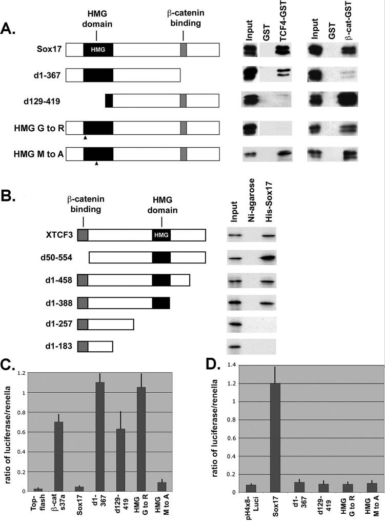 Figure 6. Structure-function analyses of Sox17-TCF-β-catenin interactions. (A) Sox17 interacts with TCF4 protein via its HMG domain. The left panel shows a schematic diagram of Sox17 deletions and point mutations. HMG mutant 1 carries a stringent mutation (G to R at amino acid 103), and HMG mutant 2 carries a more conservative mutation (M to A at amino acid 76). d1-367, now contains amino acids 1 to 367; d129-419, now contains amino acids 129 to 419. The right panel shows the interaction of in vitro-translated Sox17 mutant proteins (V5 tagged) with GST alone, TCF4-GST, or β-catenin (β-cat)-GST. (B) Identification of protein domains of TCF3 that mediate its interaction with Sox17. The left panel shows a schematic diagram of deletions of Xenopus TCF3. The right panel shows the interaction of the in vitro-translated S35-labeled TCF3 mutant proteins with His-tagged Xenopus Sox17β or Ni-agarose alone. (C) Sox17 requires interactions with both β-catenin and TCF/LEF to antagonize Wnt activity. COS cells were transfected with β-catenin(S37A) and TOP-flash alone or together with the Sox17 mutant forms, and TOP-flash activity was measured after 48 h. Error bars indicate standard errors of the means of results for replicate samples from at least three separate experiments. (D) Sox17 does not require transcriptional activity to antagonize Wnt activity. 293T cells were cotransfected with Sox17 and derived mutant forms and a Sox17 reporter plasmid (pH4X8-Luci). The transcriptional activity of Sox17 requires a functional DNA binding domain (HMG domain) and a functional transactivation domain (at the C terminus). While the Sox17 HMG mutant form carrying an M-to-A mutation is transcriptionally inactive, it still is able to interact with both TCF4 and β-catenin and antagonize Wnt activity. Error bars indicate standard errors of the means of results for replicate samples from two separate experiments. |