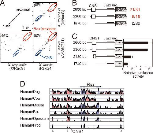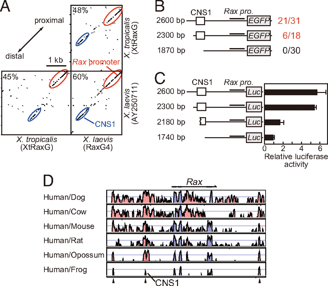 Fig. 1. Conservation and cis-regulatory activity of the sequences upstream of Rax. (A) Comparison of three upstream sequences of frog Rax (X. laevis, AY250711 and RaxG4; X. tropicalis, XtRaxG). A proximal region that contains a minimal promoter and transcriptional start site (red), as well as a distal noncoding region (blue), are highly conserved among the three clones. The distal region is termed the conserved noncoding sequence 1 (CNS1). The percentages indicate sequence similarities. (B) Transgenesis in X. laevis. Two constructs contain CNS1 and up-regulate the EGFP reporter. The number of transgenic embryos that express EGFP in the optic vesicles of normally developing embryos obtained in this assay is indicated on the right. Black lines indicate the Rax promoter. (C) Luciferase reporter activities of sequences upstream of Rax in X. laevis embryos. (D) VISTA view of the occurrence of the conserved sequence domain in the genomic region that encompasses the Rax gene. Colored peaks (purple, coding; pink, noncoding) indicate regions of at least 100 bp and 60% similarity. There are three conserved noncoding regions (arrowheads) in a region of â20 kb, and the most proximal one is CNS1.