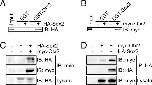 Fig. 4. Physical interactions between Otx2 and Sox2 proteins in vitro and in vivo. (A) GST pulldown by immobilized GST-Otx2 of in vitro-translated HA-Sox2 protein. (B) GST pulldown by immobilized GST-Sox2 of in vitro-translated myc-Otx2 protein. (C and D) Coimmunoprecipitation assays demonstrating in vivo interactions between the Otx2 and Sox2 proteins. (C) HA-Sox2 is coimmunoprecipitated with myc-Otx2 by the anti-myc antibody (9E10). (D) Myc-Otx2 is coimmunoprecipitated with HA-Sox2 by the anti-HA antibody (Y-11). Full scans of the Western blotting data are presented in Fig. S7.