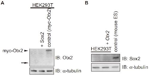 transfection with Sox2. HEK293T cells transfected with myc-Otx2 are used as a positive control. The arrow and arrowhead indicate endogenous Otx2 and