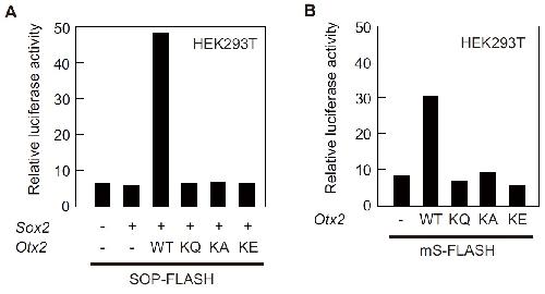 of Otx2 with glutamine (KQ), alanine (KA), or glutamic acid (KE) abolishes the synergistic activation by Sox2 and Otx2 of the reporter vector SOP-FLASH. The