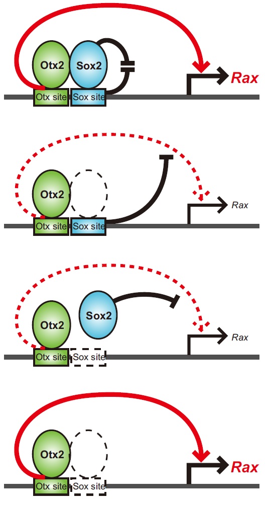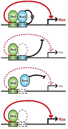 of Otx2 and Sox2. The absence of either the Sox2 protein or Sox-binding site results in loss of transcription. However, in the absence of both these factors, Otx2