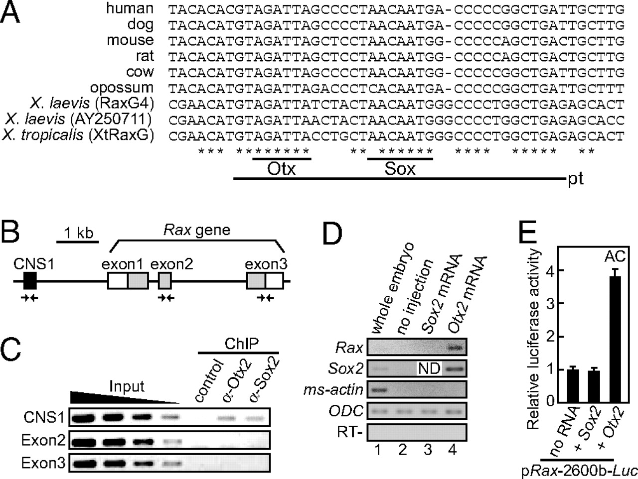 Fig. 2. Otx2 and Sox2 are upstream regulators of Rax. (A) Multiple DNA sequence alignment of vertebrate CNS1. CNS1 contains a specially conserved 35-nucleotide sequence (pentatriacontamer, pt) that contains consensus binding sites for Otx and Sox. (B) Genomic structure of the Xenopus Rax locus. Arrows indicate the primers used in the ChIP assays. CNS1, the coding region and untranslated region of Rax are indicated as black, gray, and white boxes, respectively. (C) The ChIP assay demonstrates that endogenous Otx2 and Sox2 proteins bind to CNS1 in vivo. (D) RT-PCR analysis showing that overexpression of Otx2, but not of Sox2, induces Rax in Xenopus animal cap cells. (E) Luciferase assays using Xenopus animal cap (AC) cells shows that overexpression of Otx2 induces transcriptional activation of pRax-2600b-Luc, whereas Sox2 overexpression does not. (D and E) Sox2 or Otx2 mRNA (100 pg) was injected.