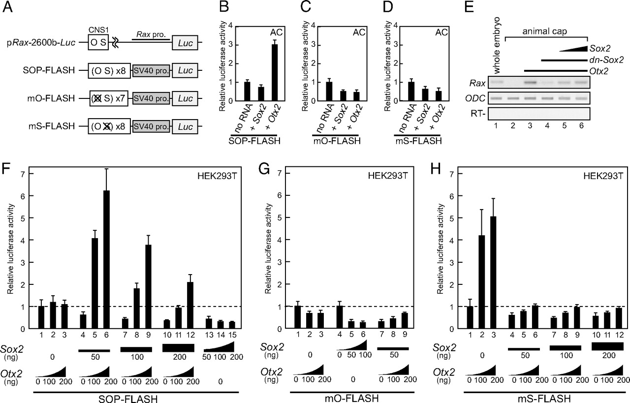 Fig. 3. Synergistic actions of Otx2 and Sox2 on transcription via CNS1. (A) Diagram of luciferase reporter constructs used in the present work. (BâD) Luciferase assays using Xenopus animal cap (AC) cells. Transcription from SOP-FLASH (B) is induced by the injection of Otx2 mRNA (100 pg) but not by the injection of Sox2 mRNA (100 pg). Overexpression of Otx2 does not induce transcription from either mO-FLASH (C) or mS-FLASH (D). (E) RT-PCR analysis shows that dominant-negative Sox2 (dn-Sox2) represses Otx2-induced Rax expression in animal cap cells. The amounts of mRNA injected were: Otx2, 100 pg; dn-Sox2, 1,000 pg; and Sox2, 10 or 30 pg. (FâH) Luciferase assays using HEK293T cells. (F) Synergistic effect of Otx2 and Sox2 on transcription from SOP-FLASH. (G) Transcription from mO-FLASH is not induced by the combination of Otx2 and Sox2 in HEK293T cells. (H) From mS-FLASH, transcription is induced by transfection with Otx2 alone in HEK293T cells. This increase is attenuated rather than enhanced by the addition of Sox2.