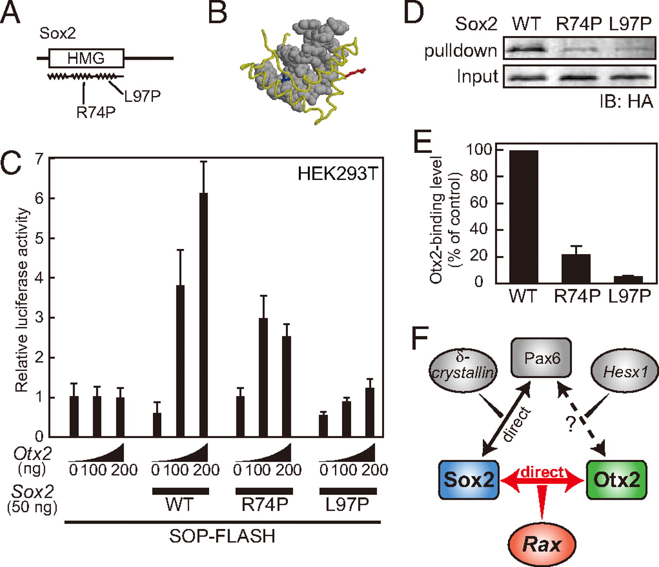 Fig. 5. Missense mutations in the Sox2 HMG domain affect the activities of Sox2 protein associated with Otx2. (A) Missense mutations identified in helices 2 and 3 of the human Sox2 HMG domain (R74P and L97P). (B) The 3D structure of the Sox2 HMG domain (yellow) binding to DNA (gray), based on a previous study (30). The side chains of the 74th arginine (blue) and 97th lysine (red) do not come in direct contact with the DNA. (C) Mutated Sox2 proteins do not induce transcription via CNS1 in cooperation with Otx2. (D) GST pulldown assay showing that the mutated Sox2 proteins lose Otx2-binding activity. HA-tagged Sox2 proteins were in vitro-synthesized and pulled down by GST-Otx2, followed by Western blotting with antibody against HA-tag. (E) Quantification of Otx2-binding levels by using the Odyssey infrared imaging system. Error bars indicate SD values. (F) Molecular relationships among ocular malformation-associated genes. The present work demonstrates that a direct interaction between the Otx2 and Sox2 proteins coordinately regulates Rax expression (colored). Upstream proteins and target genes are indicated as round rectangles and ovals, respectively. A full scan of the Western blotting data is shown in Fig. S7.