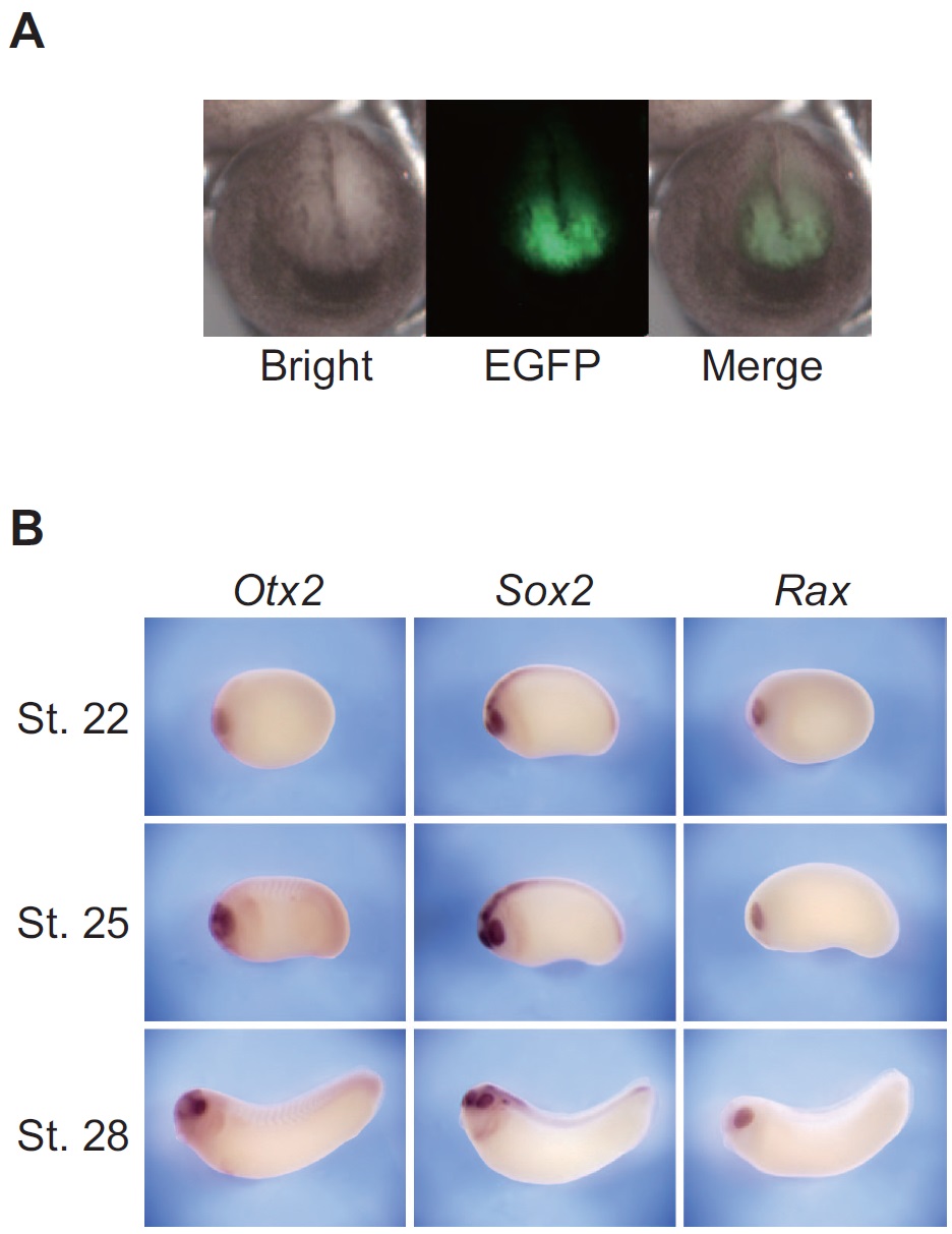 X. laevis Rax gene drives the expression of the reporter gene EGFP. At the neurula stage, EGFP protein is expressed in the optic vesicle, where endogenous Rax