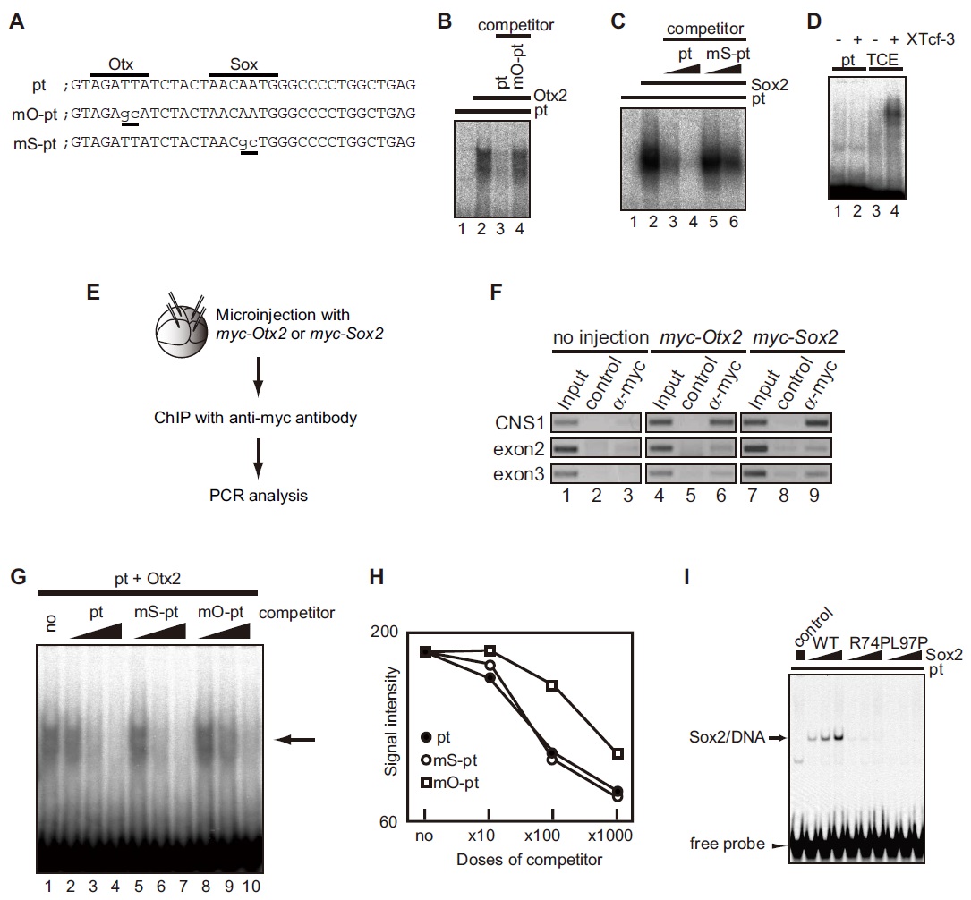 by the Otx2 protein is decreased 100-fold by the addition of intact pt competitor but not by the addition of mO-pt. (C) EMSA showing that Sox2 binds specifically