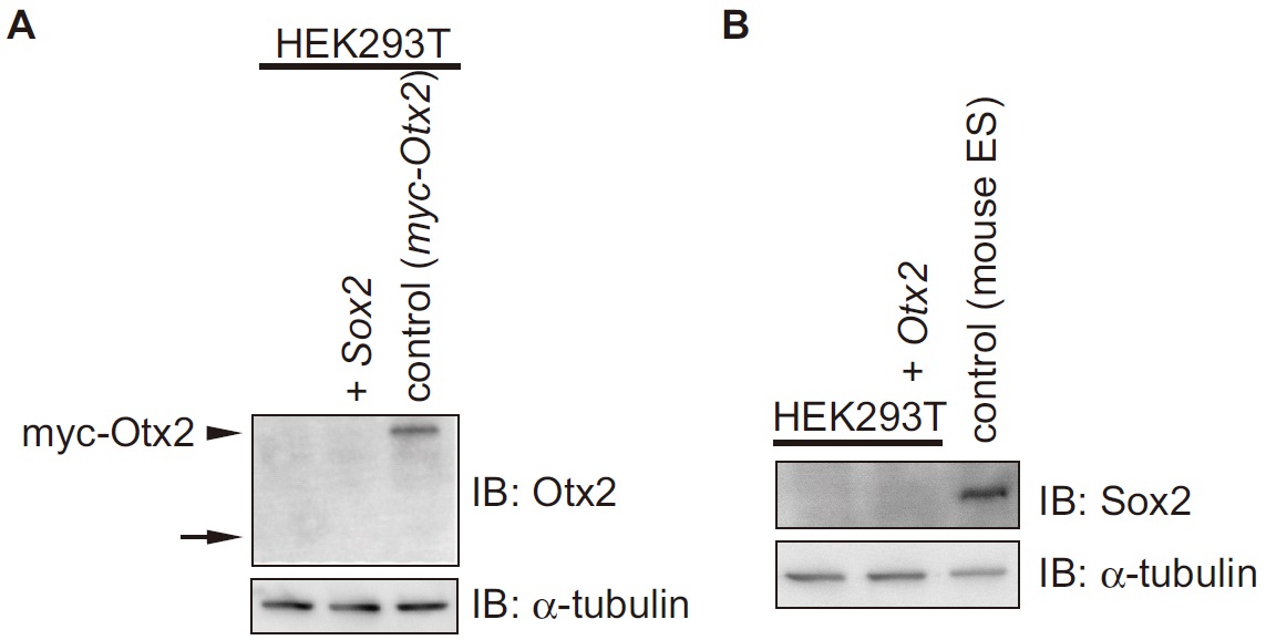 Fig. S3. Lack of endogenous expression of the Otx2 and Sox2 proteins in HEK293T cells. (A) In HEK293T cells, the Otx2 protein is not expressed or induced by