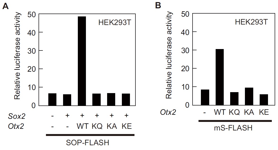 amounts of Otx2 (WT, KQ, KA, or KE) and Sox2 plasmids used were 100 ng and 30 ng, respectively. (B) For mS-FLASH, the increase in transcription caused by Otx2