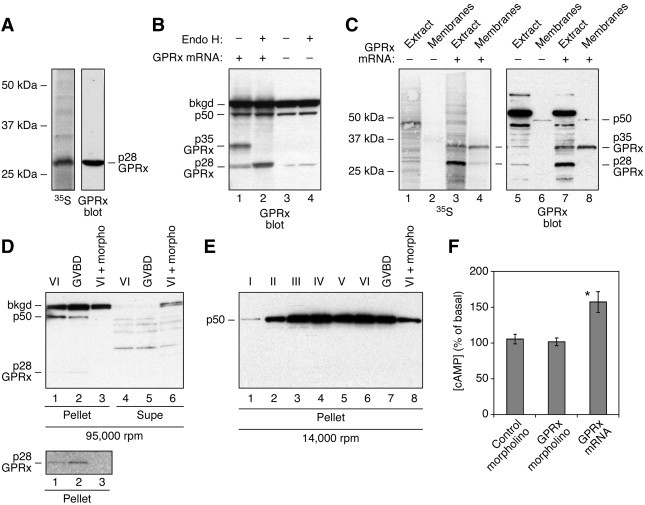 Fig. 3. Characterization of the GPRx protein. (A) In vitro transcription and translation of GPRx in rabbit reticulocyte lysates. The GPRx cDNA (1 μg per reaction) was transcribed with SP6-RNA polymerase and translated in the presence of [35S]methionine. The reactions were analyzed by SDS PAGE followed by autoradiography and GPRx immunoblotting. (B) Ectopic expression of GPRx in Xenopus laevis oocytes. Oocytes were injected with GPRx mRNA (32 ng/oocyte) and allowed to express for 24 h. Membranes were prepared by centrifugation at 12,000 rpm and treated with or without endoglycosidase H (Endo H, 500 U per reaction) for 1 h. Proteins were analyzed by GPRx immunoblotting. (C) In vitro translation of GPRx in Xenopus laevis egg extracts. GPRx mRNA (1 μg) was translated in the presence of [35S]methionine. Samples of the whole reaction mixture (âExtractâ) or membrane fractions (âMembraneâ) were analyzed by autoradiography and GPRx immunoblotting. (D) Endogenous oocyte proteins recognized by the GPRx antibody. Membranes were prepared by 95,000 rpm centrifugation. Lane 1, membranes from stage VI oocytes; lane 2, membranes from stage VI oocytes treated with 5 μM progesterone to induce maturation; lane 3, membranes from stage VI oocytes injected with 64 ng morpholinos; lane 4, supernatant from stage VI oocytes; lane 5, supernatant from stage VI oocytes treated with 5 μM progesterone to induce maturation; lane 6, supernatant from stage VI oocytes injected with 64 ng morpholinos. The inset shows a section of the same blot with the contrast and brightness adjusted to make the faint p28 band more apparent. (E) Accumulation of the p50 protein during oogenesis. Membranes were prepared by 14,000 rpm centrifugation. From lane 1 to 6, all stages oocytes; lane 7, membranes from stage VI oocytes treated with 5 μM progesterone to induce maturation; lane 8, membranes from stage VI oocytes injected with 64 ng morpholinos. (F) cAMP levels in oocytes microinjected with GPRx mRNA (23 ng/oocyte), GPRx morpholino oligonucleotides 51 ng/oocyte), or control morpholinos (50 ng/oocyte). Data are shown as means ± S.E. from 20 experiments and are expressed relative to uninjected controls. The difference between the cAMP levels in the GPRx mRNA-injected oocytes and uninjected controls was statistically significant by the Student's t-test (P = 0.0009). The difference between the cAMP levels in the GPRx morpholino-injected oocytes and the control morpholino-injected oocytes was 3 ± 8.6%, which was not significant.