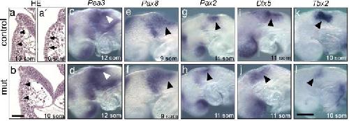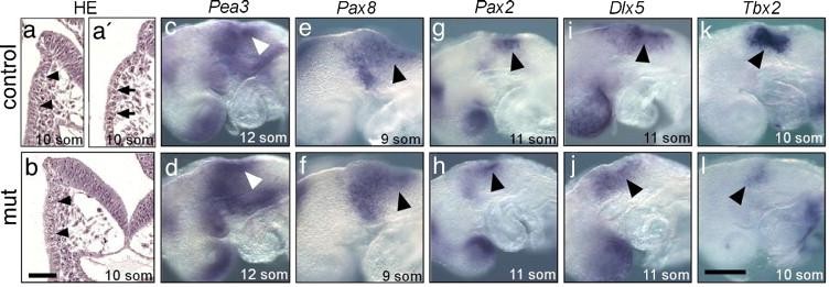 Fig. 2. Otic specification occurs in the absence of Sox9. (a, b) Hematoxylin/eosin-stained transverse sections through the otic region of control and Sox9 mutant (mut) embryos at the 10-somite stage reveal a thickening of the ectoderm in both embryos (arrowheads). Panel aâ² shows a hematoxylin/eosin-stained section through the same embryo as in panel a but at a level posterior to the otic region to show the thickness of non-otic headectoderm (arrows) for comparison. (câj) Whole mount in situ hybridizations with the indicated probes and at the indicated stages show similar expression of markers of otic specification in mutant and control embryos. (k, l) Expression of Tbx2 in the otic ectoderm is reduced in the absence of Sox9. In panels câl, anterior is to the left, arrowheads label the otic placode. The scale bar in panel b corresponds to 50 μm in panels a, aâ², b; the scale bar in panel l corresponds to 400 μm in panels câl.