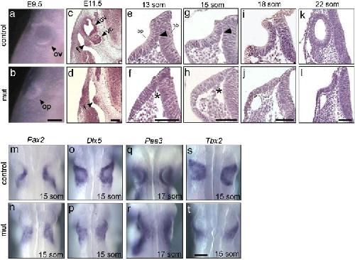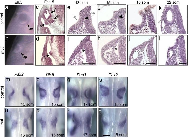 Fig. 3. Foxg1-Cre-mediated recombination of Sox9 blocks otic vesicle formation despite continuous expression of markers of otic specification, and results in loss of otic structures. (a, b) Whole mount view of the otic primordium of control and Sox9 mutant embryos at E9.5. Note that an otic vesicle has formed in the control embryo, whereas otic development is arrested at the placode stage in the Sox9 mutant. (c, d) Hematoxylin/eosin-stained sections through the otic region of control and Sox9 mutant embryos at E11.5. Note the complete absence of otic structures in the mutant. (eâl) Hematoxylin/eosin-stained sections through the otic region of control and Sox9 mutant (mut) embryos at the 13- to 22-somite stage (E8.5 to E9.0) reveal a failure of Sox9 mutant placodes to invaginate. Arrowheads in panels e and g indicate association between the otic placode and the hindbrain, asterisks in panels f and h the absence of this association in mutants. (mât) Whole mount in situ hybridizations with the indicated probes and at the indicated stages. Except for Tbx2, patterns in mutant embryos resemble the patterns in control embryos prior to otic placode invagination. (f) facial (geniculate) ganglion; (hb) hindbrain; (op) otic placode; (ov) otic vesicle; (som) somites; (vc) vestibular cochlear ganglion. The scale bars in panels aâl correspond to 100 μm. the scale bar in panel t corresponds to 200 μm in panels mât.