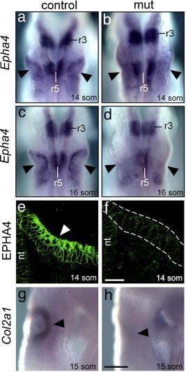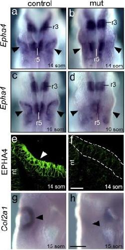 Fig. 5. Epha4 and Col2a1 expression is downregulated in Sox9 mutant placodes. (aâd) Whole mount in situ hybridization with an Epha4 probe reveals a slightly weaker and less defined Epha4 expression in mutant placodes at the 14 somite stage (a, b), and a strong reduction at the 16 somite stage (c, d). (e, f) Anti-Epha4 immunofluorescence on sections through the otic placode reveals robust membrane associated staining in control placodes and only weak staining in mutant placodes. The mutant placode in panel f is outlined with a dashed line. (g, h) Whole mount in situ hybridization with a Col2a1 probe. Col2a1 expression can not be detected in mutant placodes at the 15-somite stage. Arrowheads label the position of the otic placode. (nt) labels the neural tube, r3 and r5 label rhombomers-3 and -5, respectively. The scale bar in (h) corresponds to 250 μm in panels aâd, and 200 μm in panels g, h; the scale bar in panel f to 50 μm in panels e, f.