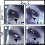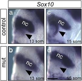 Fig. 7. Sox10 is not expressed in Sox9 mutant otic placodes. (aâd) Whole mount in situ hybridization of control (a, c) and Sox9 mutant (b, d) embryos with a Sox10 probe at the 13- (a, b) and 15-somite (c, d) stage. Arrowheads label the otic placode. (nc) labels Sox10 expression in neural crest cells. The scale bar in panel d corresponds to 200 μm in panels aâd.
