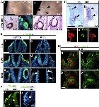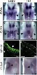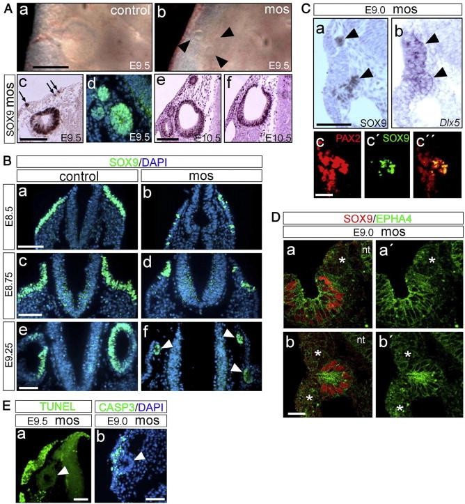 Fig. 8. Phenotype of Sox9 mosaic embryos. (A) Sox9 mosaic embryos form one or several small Sox9-positive otic vesicles. (Aa, b) Whole mount view of the otic region of a control and Sox9 mosaic (mos) embryo at E9.5. Arrowheads label the otic vesicles. (Acâf) Sections through the otic region of Sox9 mosaic embryos at E9.5 and E10.5, stained with a Sox9-specific antibody. Small arrows in panel c label individual Sox9-positive cells among Sox9-negative non-invaginating placode cells. (B) Sox9 immunofluorescence on sections through the otic region of E8.5 to E9.25 control (Ba, c, e) and Sox9 mosaic (Bb, d, f) embryos. Arrowheads in panel f label invaginating clusters of Sox9-positive cells. (C) Sox9-positive and -negative cells in E9.0 Sox9 mosaic placodes express Dlx5 and Pax2, but only Sox9-positive cells invaginate. (Ca) Sox9 immunohistochemistry, (Cb) Dlx5 in situ hybridization on a neighboring section to the section in panel Ca. Arrowheads label invaginating Sox9-positive cell clusters. (Ccâcâ²) Double-immunofluorescence against Pax2 (c, red) and Sox9 (câ², green) and overlay (câ²). (D) Double-immunofluorescence against Epha4 (green) and Sox9 (red). (a, b) Overlays, (aâ², bâ²) detection of Epha4 only. Asterisks label Sox9 negative regions of the placodes. (nt), neural tube. (E) Non-invaginating, Sox9-negative cells in the placode die by apoptosis. TUNEL assay (Ea) and anti-activated Caspase3 immunofluorescence (Eb) on sections through the otic region of Sox9 mosaic embryos. Note that no cell death is detected in the formed otic vesicle (Ea, arrowhead) or invaginating part of the placode (Eb, arrowhead). The sections shown in panels Ad, B, Eb) were counterstained with DAPI (blue) to label the nuclei. The scale bars in panels A, B, Ca, b, E) correspond to 100 μm, and to 20 μm in panels Ccâ²âcâ², D).