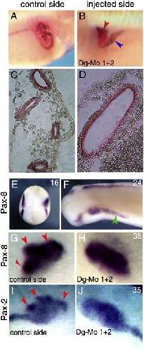 Fig. 3. Depletion of dystroglycan leads to a drastic diminution of circonvoluted tubules. (AâD) Microinjections were performed unilaterally at the 4-cell stage with Dg-Mo1Â +Â 2 (16 ng) in both left blastomeres. Embryos were fixed at stage 40 and then development of pronephros was analysed by immunochemistry staining with monoclonal antibodies 3G8 for tubules and 4A6 for ducts. (A, B) Whole-mount immunochemistry. The pronephric tubules (red arrowhead) and the anteriorduct segment (blue arrowhead) in panel B show severe developmental defects in the injected side compared to control side in panel A. (C, D) Cryostat sections of these embryos at level of the pronephros area. A single and large 3G8-positive tubule is present in the injected side (D) whereas in the control several tubules are detected (C). (EâJ) Expression of pronephros marker genes in Dg-Mo injected embryos. Embryonic stage is indicated in the top right of each panel. The expressions of the Pax-8 (EâH) and Pax-2 (I, J) genes were detected by whole-mount in situ hybridization on embryos injected unilaterally with Dg-Mo1Â +Â 2 (16 ng). The expression of the Pax-8 gene is similar in the control (right side of the embryo in panels EâG) and injected sides at all developmental stages. In spite of unchanged Pax-8 expression, some defects in the pronephros area are observed in the injected side: the duct is shorter and enlarged in stage 24 embryo (panel F, green arrowhead). In the control side of stage 35 embryo three nephrostomes (panel G, red arrowheads) are detected, in contrast in the injected side only a single structure is observed (H). In stage 35 embryo, the expression of the Pax-2 gene is not modified in the injected side (J) compared to the control (I). Here again a single structure is observed in the injected side (J) compared to the three nephrostomes observed in the control side (I).