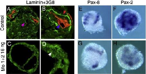 Fig. 5. Depletion of Dg affects laminin-1 assembly and tubule formation in vitro. Two-cell stage embryos were injected with Dg-Mo1Â +Â 2 (32 ng/embryo). Animal caps were treated with activin/retinoic acid for 3 h. (A, D) Immunodetection with the 3G8 antibodies and the anti-laminin antibodies. (A, B) Section of a control animal cap. 3G8 (blue arrowhead) and anti-laminin-1 (red arrowhead) antibodies staining are detected. Laminin-1 is present at the basal pole of cells of the tubules. Laminin-1 is also observed elsewhere in the explant where the tubules will be formed (purple arrowhead) (A). (C, D) Section of a Mo1Â +Â 2 injected explant (C). Large cavities and mesenchyme like tissues are observed. (D) A diffuse fluorescence is observed (white arrowhead) suggesting that laminin-1 is accumulated but does not assemble basal lamina. (EâH) Expression of pronephros marker genes in animal caps. (E, G) The expression of the Pax-8 gene is similar in the control and Mo1Â +Â 2 injected explant. (F, H) Pax-2 gene is detected in control and Mo1Â +Â 2 injected explant.