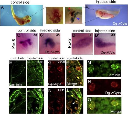 Fig. 6. Pronephros development is altered after overexpression of Dg-δCyto protein. Dg-δCyto mRNA was delivered unilaterally into both blastomeres at eight cell-stage. (A, B) Whole-mount immunochemistry of embryos injected with Dg-δCyto mRNAs performed with the 3G8 and 4A6 antibodies. In the injected side, note the defects in the pronephric tubules (red arrowhead) and the anterior segment of the duct (blue arrowhead). (CâDâ²) Expression of pronephros marker genes in Dg-δcyto mRNA injected embryos. The expression of Pax-8 gene is unchanged at stage 35 in Dg-δcyto mRNA injected embryos (Câ²) compared to the control (C). The Pax-2 gene expression is also unmodified at stage 30 (D, Dâ²). (EâO) Cryostat sections of pronephros areas were immunolabelled with the anti-laminin-1 antibodies (panels E, F, I, J). Detection of the GFP, which was used as tracer of Dg-δCyto proteins is shown in panels G and K. Panels H, L represent a merge between laminin-1 and Dg-δCyto proteins. The control and injected sides are shown at stage 29/30 and 33/34. Stages are indicated in the top right of each panel. At stage 29/30 and 33/34 in the injected side laminin-1 is detected around a small pronephros anlage (see yellow arrowheads in merge, panels H, L). Cells expressing Dg-δCyto (red fluorescence in panels G and K and white arrowhead in panel L) are excluded from this pronephros structure. (MâO) Two cells overexpressing the Dg-δCyto protein that are excluded from the pronephric area. Laminin-1 (M) and GFP-tagged Dg-δCyto (N) are detected at the surface of these cells (O). Both proteins are co-localized at the level of the cell membrane (O).