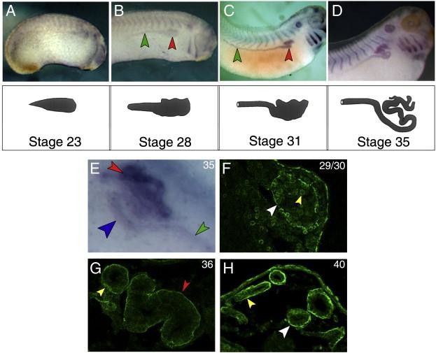 Fig. 1. Dystroglycan expression during Xenopus laevis pronephros development. Panels AâD show spatial expression of dystroglycan transcripts from stage 23 to 35, and schematic representation of the developing pronephros adapted from Vize et al. (1995). Whole-mount in situ hybridizations were performed using digoxigenin-labelled antisense αDg RNA probes. (A) Stage 23. Expression is confined to the developing pronephric tubule anlage. (BâD) Stage 28, 31 and 35. Dg transcripts are present in the nephrostomes, the pronephric tubules (red arrowhead) and in the pronephric duct (green arrowhead). Panels EâH show immunolocalization of Dg protein. Embryonic stages are indicated in the top right of each panel. (E) Stage 35. Dg is present in the pronephric tubules (red arrowhead), in the anterior and posterior segments of the pronephric duct (blue and green arrowheads). (FâH) Cryostat sections. (F) Stage 29/30. Dg protein is detected on the surface of cells into the pronephric bud (yellow arrowhead) and at the basal pole of cells surrounding the pronephric bud (white arrowhead). (G) Stage 36. The Dg is detected around the nephrostomes (yellow arrowhead) and the pronephric tubules (red arrowhead). (H) Stage 40. The Dg is present in the elongating tubules (white arrowhead), and duct (yellow arrowhead).