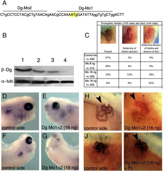 Fig. 2. Depletion of dystroglycan by antisense morpholino oligomers. (A) The positions of the antisense morpholino oligomers and ATG initiation codon are indicated. (B) Dg-Mo specificity in vivo; Western Blot analysis using anti-Dg antibody showing that the Dg-Mo interferes with in vivo translation in Xenopus embryos of Dg mRNA. Lane 1, uninjected embryos; Lanes 2â4, embryos were injected in both blastomeres at the two cell stage with 8 ng (lane 2), 16 ng (lane 3) and 18 ng (lane 4) of Dg-Mo1 + 2. At stage 28 dorsal tissues containing pronephric anlage were isolated and proteins were analysed by SDS-PAGE. α-Tubulin was used as a loading control. Significant reduction of Dg protein synthesis is observed between 8 ng and 18 ng of morpholino. (C) Frequency of the phenotypes obtained with the different concentrations of Mo analysed with the 3G8 and 4A6 antibodies. The number n indicates the total number of injected embryos. (DâG) Whole-mount immunodetection of Dg protein at stage 41 on embryos injected unilaterally at the 4-cell stage with Dg-Mo1 + 2 (16 ng, panel E and 18 ng, panel G in both left blastomeres). At the dose of 16 ng Dg-Mo1 + 2 a strong reduction of Dg immunoreactivity is observed in the injected side (E) compared to the control side (D). At 18 ng Dg-Mo1 + 2, Dg immunoreactivity is absent in the injected side (G) compared to the control (F). (HâK) The phenotype of pronephric tubules was rescued by coinjection with Dg full-length mRNA. (H, I) Pronephric tubule formation is inhibited in the Dg-Mo injected side of embryos (arrowhead in panel I) compared to the non-injected-side (arrowhead in panel H). (JâK) Pronephric tubule formation was significantly rescued in embryos injected with Dg-Mo1 + 2 (16 ng) plus Dg full-length (FL) mRNA (400 pg) (arrowhead in panel K) compared to the Dg-Mo1 + 2 injected side (arrow in panel I).