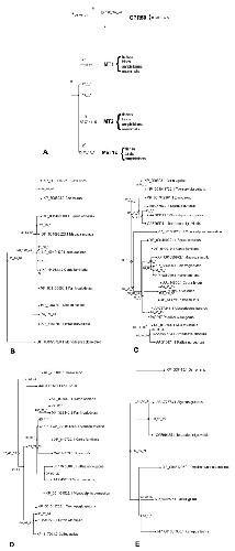 Figure 1. Phylogenetic analysis of the GPR50/MT1/MT2/Mel1c genes. (A) Overall phylogenetic tree showing 3 groups of genes: GPR50, MT1/MT2, and Mel1c genes and the animal orders where each branch is expressed. The trees (npl) are the fusion of three phylogenetic trees built based on Neighbour joining, maximum Parsimony and maximum Likelihood (see Materials and Methods section for further details). The italic letters correspond to the name given to the branches for the likelihood ratio tests (B) Phylogenetic tree of GPR50 genes. Please note that only mammalian species appear in the tree. (C) Phylogenetic tree of MT1 genes (D) Phylogenetic tree of MT2 genes. (E) Phylogenetic tree of Mel1c genes that do seem to appear only in non mammalian species. Bootstrap values are reported for each npl method.