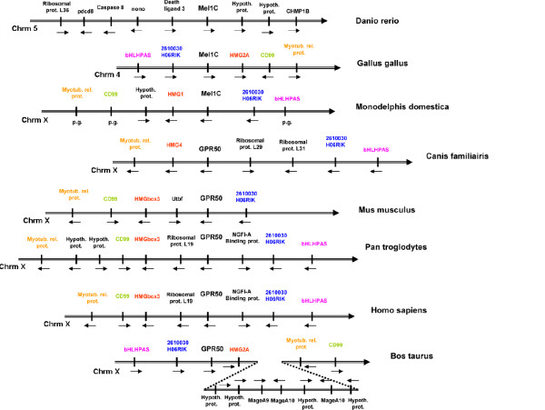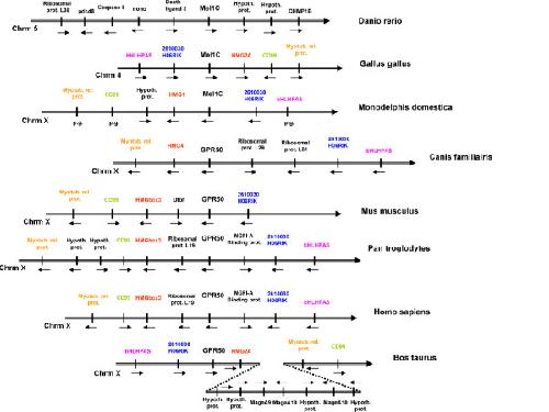 Figure 2. Synteny of Mel1c/GPR50 genes and neighbours in vertebrate genomes. Note that genes are found on chromosome 5 in zebra fish and on chromosome 4 in chicken while they are found on chromosome X in other depicted species. Please note that synteny is mostly conserved for bHLHPAS, 2610030H06 RIK, Mel1c, HMG2A, CD99, and myotubularin related protein in opossum and mammalian species despite the integration of new genes coding for hypothetical proteins (opossum, chimpanzee, cow), ribosomal proteins (dog, chimpanzee, man), NGFI-A binding protein (chimpanzee, man), Utbf (mouse) and MAGE (cattle) proteins. It is also of note that several genes surrounding Mel1c in zebra fish (pdcd8, nono, and the two hypothetical proteins) present high identities with genes found on chromosome X in mouse but not in the GPR50 locus (unpublished data). p.d.: predicted gene. Chrm: chromosome.