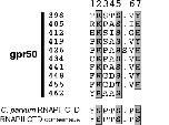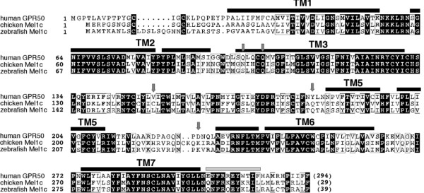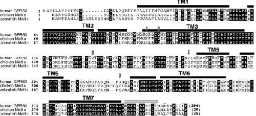 Figure 4. Sequence alignment of chicken Mel1c, zebra fish Mel1c and human GPR50. Sequence identities are reported white on a black background, whereas sequence similarities are boxed. The positions of the transmembrane helices are reported above its sequence. Arrows indicate the positions of the amino acids that, in GPR50, evolved under positive selection.