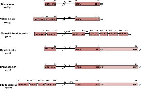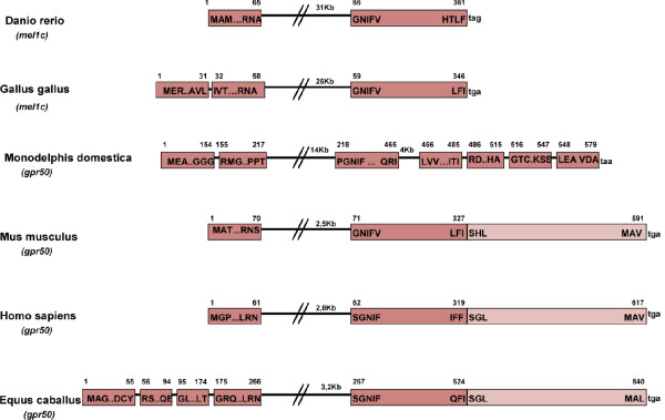 Figure 5. Schematic diagram of the Mel1c/GPR50 gene organization in zebrafish, chicken, opossum, mouse, man, and horse. The stop codon following the second exon in zebrafish and chicken is replaced by the insertion of a protein fragment reminiscent of a DNA directed RNA polymerase II in mammals (light color).