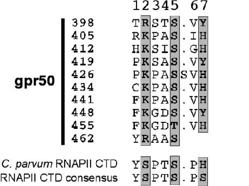 Figure 6. Alignment of the repeated heptad found in the C-terminal extension of human GPR50 and comparison with the repeated heptad observed in the C-terminal domain (CTD) of RNA polymerase II (RNAPII). The three positions (2, 5 and 7) occupied by phosphorylable serine residues in RNAPII CTD are boxed.