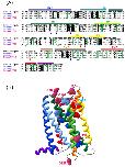 Figure 3. Sequence alignment of human MT1, MT2 and GPR50 with bovine rhodopsin (pdb 1F88). Sequence identities are reported white on a black background, whereas sequence similarities are boxed (A). The positions of the transmembrane helices, as observed in the bovine rhodopsin structure, are reported above its sequence. Arrows indicate the positions of the amino acids that, in GPR50, evolved under positive selection. Stars indicate amino acids which have been shown to play a key role for melatonin binding in MT1 (dark blue), MT2 (light blue) or both (red). A ribbon representation of the GPR50 3D structure model is represented (B), with transmembrane helices colored according to the sequence alignment. Amino acids evolving under positive selection and amino acids important for melatonin binding in MT1/MT2 are shown according to the colors reported in the sequence alignment.
