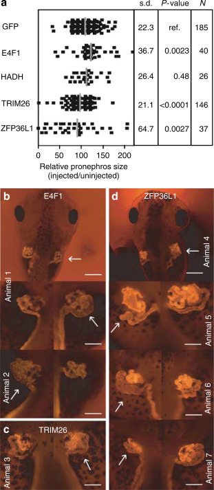 Figure 3. Influence of over-expressed HNF1β interaction partners on pronephros development in Xenopus larvae. (a) The size of pronephros on injected versus control side is given. The size was determined in lateral views by measuring the area through the widest part of the immunostained pronephros as described.17 Data were tested for Gaussian distribution and accordingly the Student's t-test was used to score significant differences. The P-value is given by comparing embryos injected with interaction partner plus GFP mRNA as marker with those injected with GFP mRNA only. N is the number of animals investigated. (b) E4F1-injected larvae are immunostained to detect pronephric tubule and duct using the antibodies 3G8 and 4A6 as described.17 The upper panel is a dorsal view and the middle panel gives lateral views (right and left) of the same larvae (animal 1). The bottom panel represents the lateral views from a distinct individual (animal 2). In all the lateral views, anterior is up and the injected side is marked by an arrow. (c) Lateral views of a TRIM26-injected larvae (animal 3) prepared as in (b). (d) ZFP36L1-injected larvae prepared as in (b) with a dorsal view (top panel, animal 4) and lateral views of three distinct larvae (animals 5â7). Bar=500 and 200â μm in the dorsal view and lateral views, respectively.