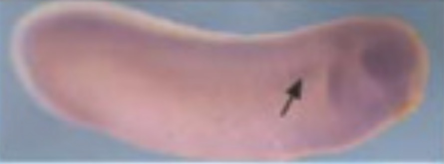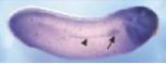 zfp36l1 (ZFP36 ring finger protein-like 1) gene expression in X.laevis embryo, NF stage 18, assayed via in situ hybridization, anteriorright, dorsal up.