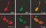 Figure 5. Cellular localization of HNF1β and the interaction partners E4F1 or ZFP36L1 in HEK293 cells. HEK293 cells were transfected with 0.9â μg Rc/CMV-GFP-HNF1β and 0.9â μg pCS2+mt-E4F1 or 0.9â μg Rc/CMV-GFP-HNF1β and 0.3â μg pCS2+mt-ZFP36L1. HNF1β is visible by green fluorescence of the GFP tag, whereas the myc-tagged E4F1 or ZFP36L1 is marked by a Cy3-coupled secondary antibody. Right panels are overlays of confocal microscopy.