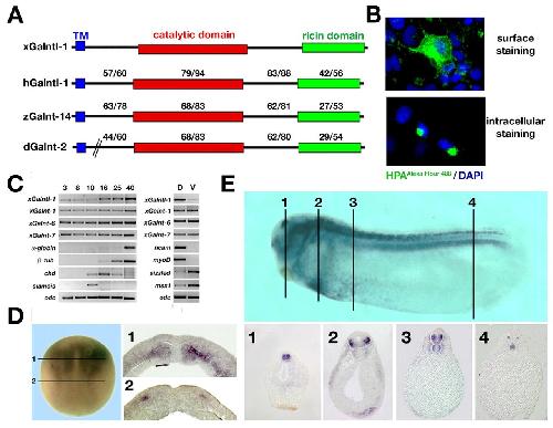 Fig. 1. Sequence and expression of xGalntl-1. (A) Comparison of Xenopus Galntl-1, human GALNTL1 (hGalntl-1), zebrafish Galnt14 (zGalnt-14) and Drosophila Galnt2 (dGalnt-2) protein sequences. The transmembrane domain (TM, blue), the catalytic domain (red), the Ricin domain (green) and amino acid identities/similarities for the different protein domains are indicated. (B) Detection of mucin-type glycosylation at the cell surface and in the Golgi compartment in xGalntl-1-transfected Cos-7 cells using Helix pomatia agglutinin (HPA) conjugated to Alexa Fluor 488. (C) RT-PCR analysis of xGalntl-1, xGalnt-1, xGalnt-6 and xGalnt-7 expression, using RNA from whole embryos (left) or dorsal and ventral marginal zone explants, isolated at gastrula stages and analysed at stage 20 (right). The blood markerα -globin, neural marker β-tubulin, dorsal mesodermal marker chordin and the nieuwkoop centre-specific gene siamois were used as references for the indicated developmental stages. Dorsal (ncam, myoD) and ventral (sizzled, msx1) marker genes were used as controls for the marginal zone explants. (D) Whole-mount in situ hybridisation analysis of xGalntl-1 expression at stage 13. Numbered lines indicate the positions of vibratome sections that reveal xGalntl-1 expression in the anterior mesoderm and in the deep layer of the lateral neural plate. (E) In situ analysis of xGalntl-1 expression at stage 27. The paraffin sections below show specific expression of xGalntl-1 in the anterior brain (1), neural crest (2), mediolateral spinal cord (2-4) and notochord (3,4).