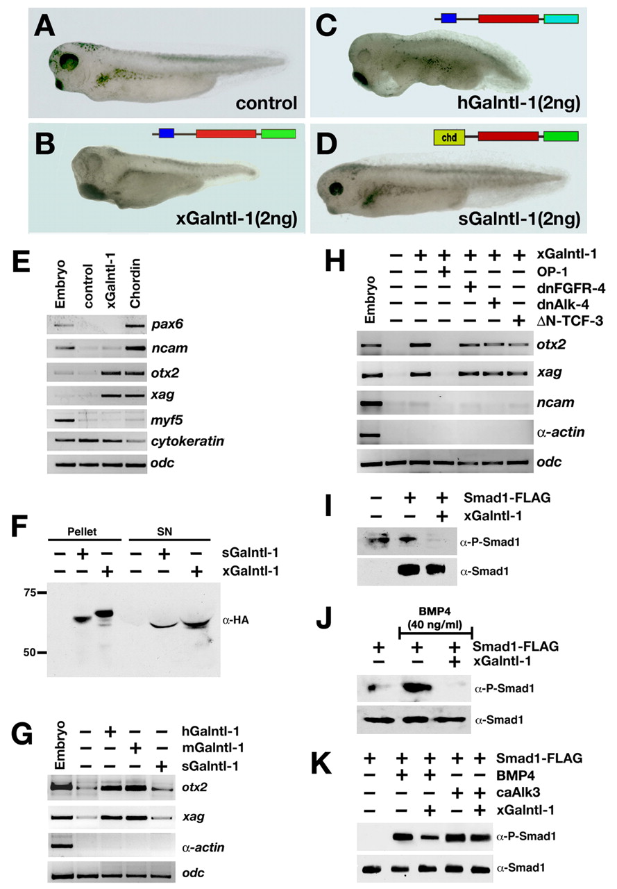 Inhibition of BMP signalling by Galntl-1. (A-D) Stage 36 embryos that were injected animally at the 8-cell stage with a total of 2 ng of mRNA encoding xGalntl-1, human GALNTL1 (hGalntl-1) or secreted Galntl-1 (sGalntl-1), with the N-terminal transmembrane domain replaced by the Chordin leader peptide. (E) RT-PCR analysis of animal cap explants from embryos injected with 2 ng xGalntl-1 or 40 pg chordin mRNA at stage 20 for neural (pax6, ncam, otx2), anterior (xag), muscle (myf5) and epidermal (cytokeratin) marker genes. (F) Western blot of the supernatant (SN) and cell pellet of dissociated ectodermal cells expressing the xGalntl-1 or sGalntl-1 with a C-terminal HA-TAG. (G) RT-PCR analysis of animal cap explants from embryos microinjected with mRNA encoding human, mouse (m) or secreted forms of Galntl-1. (H) RT-PCR analysis of animal cap explants from embryos microinjected with mRNA encoding xGalntl-1 (1 ng) alone or in combination with mRNA encoding BMP7/OP-1 (400 pg), dnFGFR-4 (400 pg), dnAlk-4 (400 pg) or ΔN-TCF-3 (400 pg). (I) Western blot for Smad1 or phospho-Smad1 using animal cap lysates from uninjected embryos or embryos microinjected with 200 pg Smad1-FLAG mRNA alone or together with 200 pg xGalntl-1 mRNA. (J) Western blot analysis for Smad1 and phospho-Smad1 from transiently transfected Hek293T cells treated for 2 hours with 40 ng/ml recombinant BMP4 protein. (K) Western blot for phospho-Smad1 or Smad1 using lysates from HEK 293T cells transiently transfected with the indicated expression plasmids. In the RT-PCR experiments α-actin or myf-5 served as controls for mesoderm contamination; odc as a loading control.