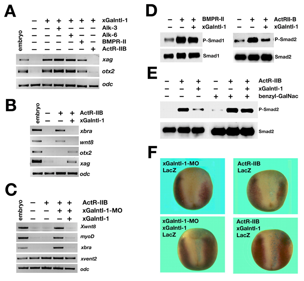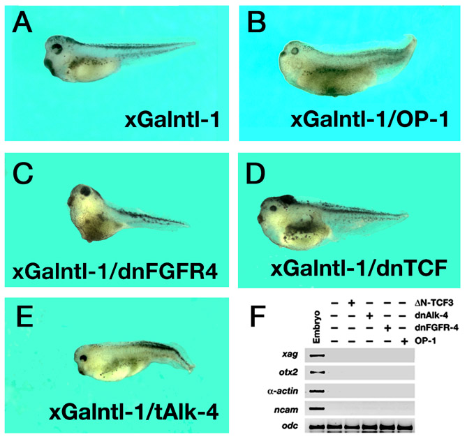 Fig. S2. Effect of OP-1, dnFGFR4, dnTCF3 or dnALK-4 on the xGalntl-1 phenotype. (A-E) Stage 40 embryos microinjected with 200 pg xGalntl-1 mRNA alone (A) or together with 200 pg OP-1 (B), dnFGFR-4 (C), dnTCF-3 (D) or dnAlk-4 (E). (F) RT-PCR analysis of ectodermal explants obtained from sibling embryos at stage 9 and analyzed at stage 25.
