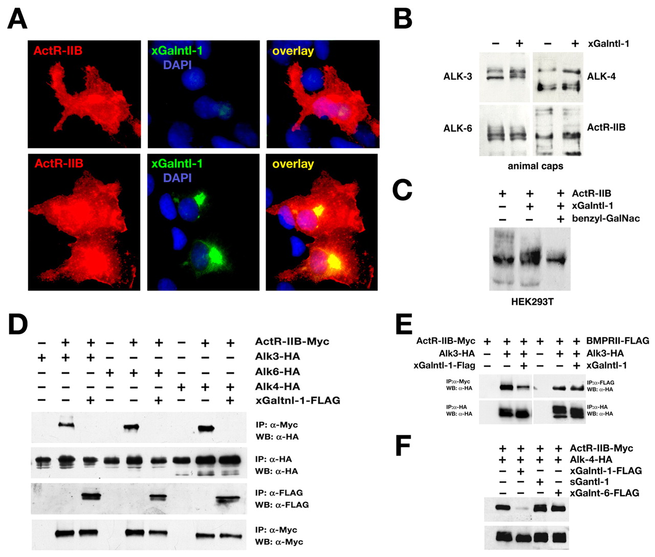 Galntl-1 inhibits the binding of ActR-IIB to type I receptors. (A) Immunohistochemical staining of transiently transfected Cos-7 cells for ActR-IIB containing a C-terminal HA-TAG and xGalntl-1 containing a C-terminal FLAG-TAG. (B) Western blot analyses of stage 11 Xenopus animal cap cells expressing HA-tagged ActR-IIB, Alk-3, Alk-4 and Alk-6 and xGalntl-1. (C) Western blot analyses of transiently transfected HEK 293T cells expressing HA-tagged xActR-IIB and xGalntl-1 and incubated overnight in the presence or absence of 2 mM benzyl-GalNAc. (D) Co-immunoprecipitation of HA-tagged Alk-3, Alk-4 and Alk-6 with MYC-tagged ActR-IIB in the presence or absence of FLAG-tagged xGalntl-1 from lysates of transiently transfected HEK 293T cells. (E) Co-immunprecipitation of Alk-3 with Myc-tagged ActR-IIB or FLAG-tagged BMPR-II in the presence or absence of untagged xGalntl-1. The binding of BMPR-II to Alk-3 does not seem to be inhibited by xGAlntl-1. (F) Co-immunprecipitation of Alk-4-HA with ActR-IIB-Myc in the presence of xGalntl-1, sGalntl-1 or xGalnt-6. Only xGalntl-1 interfered with the formation of the heteromeric complex. In all experiments, 10% of the lysates used for co-immunprecipitation was subjected to direct immunprecipitation and the quantity of protein analysed by western blotting for the different epitopes.