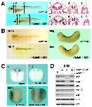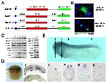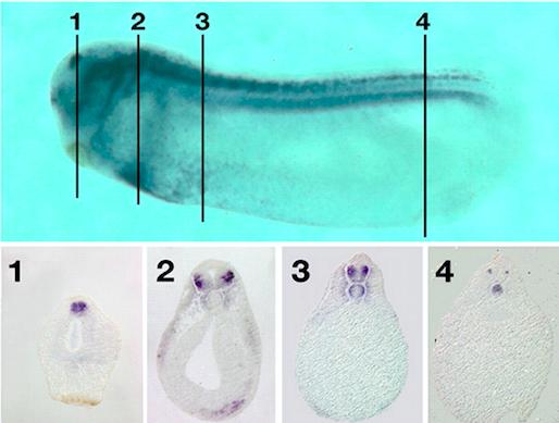 Figure 1, (E) In situ analysis of galnt16 (polypeptide N-acetylgalactosaminyltransferase 16; xGalntl-1) expression at stage 27. The paraffin sections below show specific expression of xGalntl-1 in the anterior brain (1), neural crest (2), mediolateral spinal cord (2-4) and notochord (3,4).