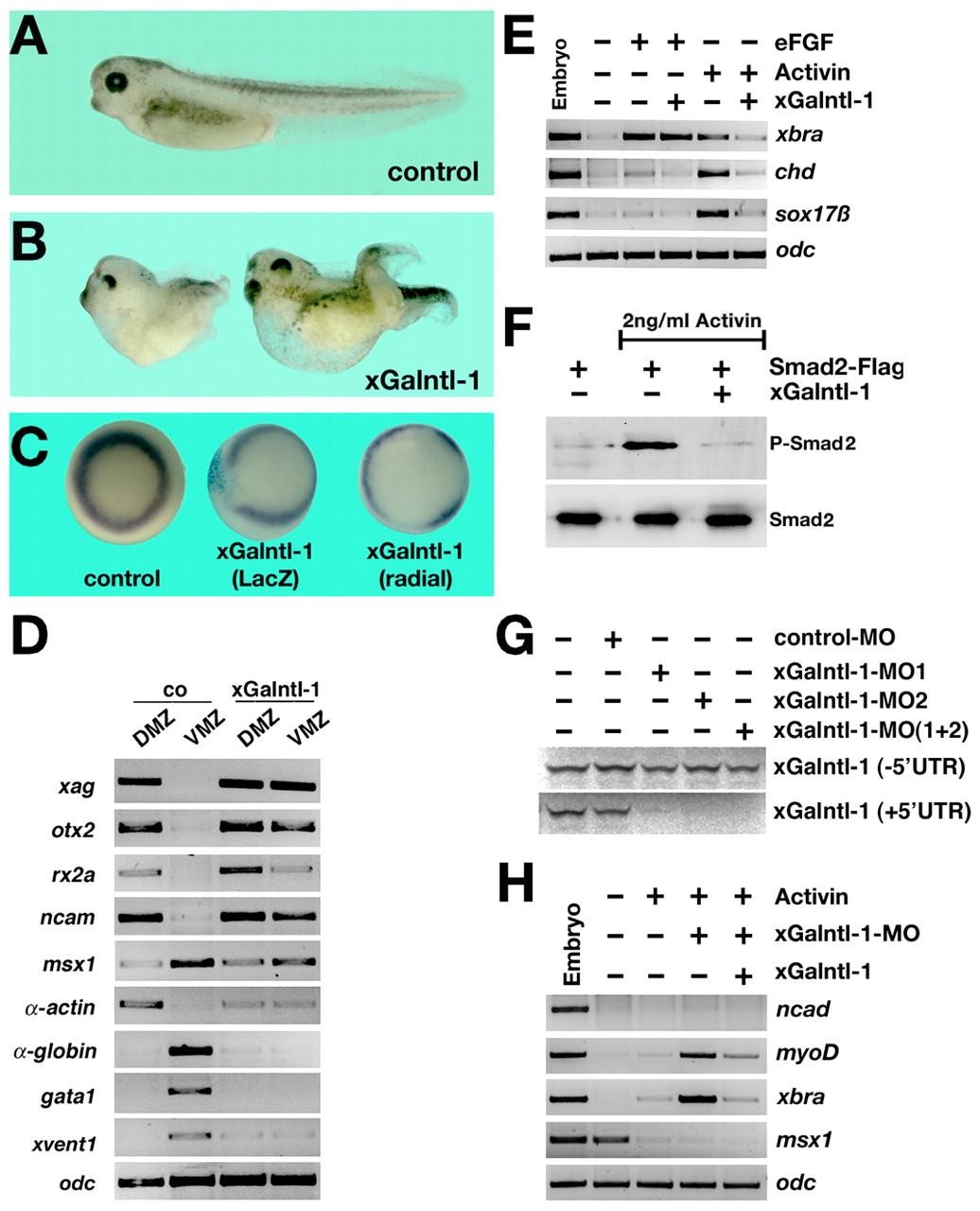 Fig. 2. Inhibition of mesoderm formation and Activin signalling by xGalntl-1. (A) Stage 40 uninjected control Xenopus embryo and (B) sibling embryos microinjected radially with 400 pg xGalntl-1 mRNA at 2- to 4-cell stages. (C) In situ hybridisation for the pan-mesodermal marker xbra in gastrula stage embryo microinjected either radially with xGalntl-1 mRNA alone or into single blastomeres together with lacZ mRNA at the 4-cell stage. (D) RT-PCR analysis of dorsal (DMZ) and ventral marginal zone (VMZ) explants at stage 20. The expression of α-globin (blood), gata1 and xvent1 (ventral mesoderm), msx1 (neural crest, epidermis) was reduced in VMZ from embryos microinjected with 200 pg xGalntl-1 mRNA, whereas the expression levels of xag (cement gland), otx2, rx2a (forebrain) and ncam (neural) were increased. The expression of α-actin (muscle) was reduced in DMZ and slightly increased in VMZ. (E) RT-PCR analysis for chordin (dorsal mesoderm), sox17β (endoderm) and xbra (mesoderm) expression using stage 20 animal cap explants from embryos microinjected with mRNA encoding eFGF (100 pg) or Activin (2 pg), in the presence or absence of 200 pg xGalntl-1 mRNA. (F) Western blot analysis of Smad and phospho-Smad proteins from HEK 293T cells that were transiently transfected with Smad2-FLAG and xGalntl-1 expression vectors and cultured for 2 hours in the absence or presence of 2ng/ml recombinant Activin protein. (G) In vitro translation of xGalntl-1 mRNA containing (+5â²-UTR) or lacking (-5â²-UTR) morpholino target sequences. Two different morpholinos (Galntl-1-MO1 and Galntl-1-MO2, 2.5 μm) as well as a mixture of both (1.25 μm each) specifically interfered with translation of RNA containing the morpholino target sequences. (H) RT-PCR analysis of animal cap explants at stage 20 from embryos microinjected with 0.5 pg Activin mRNA, xGalntl-1 morpholinos (1 ng each) and 20 pg xGalntl-1 mRNA. The morpholino stimulated the induction of myoD (muscle) and xbra expression by Activin. In all RT-PCR experiments, odc served as a loading control.