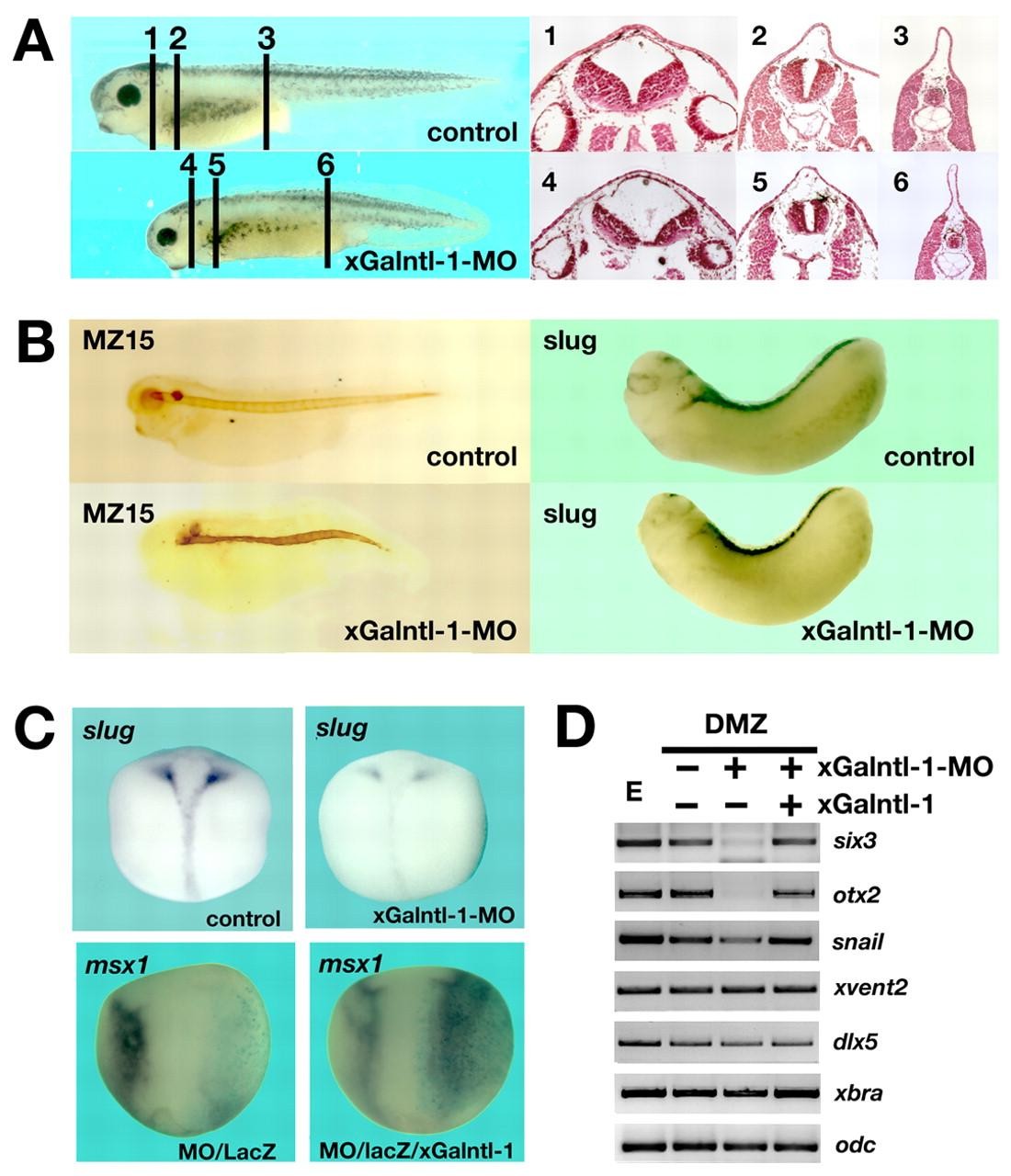 Fig. 4. Xenopus Galntl-1 loss-of-function phenotype. (A) Stage 40 uninjected control embryo and embryo injected radially with the xGalntl-1-specific morpholinos at the 2- to 4-cell stage. Numbered lines indicate the positions of the paraffin sections shown on the right that reveal a reduction of neural tissue in the morpholino-injected embryos. (B) Uninjected control embryo and embryos microinjected with xGalntl-1 morpholinos stained with the notochord-specific antibody MZ15 at stage 40 (left) and analysed by in situ hybridisation for slug expression at stage 30. The morpholino-injected embryos display defects in the anterior notochord and reduced anterior expression of slug. (C) Whole-mount in situ hybridisation for slug of stage 15 embryos after radial microinjection of the xGalntl-1 morpholinos at the 2- to 4-cell stage, and stage 13 embryo stained for msx1 after single injections of the xGalntl-1 morpholinos into a dorsal-animal blastomere at the 8-cell stage together with lacZ mRNA. (D) RT-PCR analysis of stage 20 dorsal marginal zone explants from uninjected embryos or embryos microinjected with xGalntl-1 morpholinos alone or together with xGalntl-1 mRNA (20 pg). The expression of otx2 and six3 (forebrain) as well as of snail (neural crest) was inhibited by the xGalntl-1 morpholinos, whereas the expression of dlx5 (epidermis), xvent2 (ventral mesoderm) and xbra (mesoderm) was unaffected.