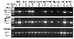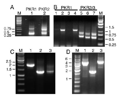 Figure 1. PCR for cloning of T. nigroviridis PKR genes. (A) Results for 5' RACE PCRs with T. nigroviridis cDNA are shown for primers specific for PKR1 (lane 1) and PKR2 (lane 2). M denotes the 1 kb marker. Fragments are labeled in kb. (B) shows the results of 3' RACE PCR using four different forward primers used in primary and nested PCRs for PKR1 (lanes 1–4) and three different forward primers combinations for PKR2 and PKR3 (lanes 5–7). The smaller fragment represents PKR2 and the larger one represents PKR3. (C) PCR products are shown using primers covering the complete open reading frames of PKR1 (lane 1), PKR2 (lane 2) and PKR3 (lane 3). (D) PCR reactions of overlapping regions were performed with genomic DNA to elucidate the genomic organization of PKR1. Lanes 1 and 2 show the PCR products obtained with primers spanning the region between the 5' untranslated region of PKR1 and exon 15 and exon 14 and the 3' untranslated region of exon 19, respectively. PCR product shown in lane 3 was obtained with primers covering exon 17 of PKR1 and exon 7 of PKR2. PCR products were cloned and completely sequenced.