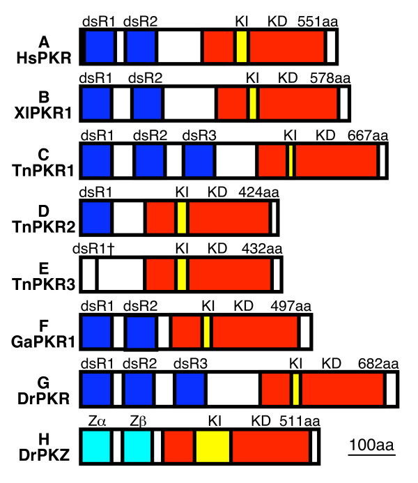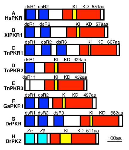 Figure 2. Schematic presentation of the domain organization of PKR and PKZ genes. The domain organization of PKR and PKZ genes from (A) H. sapiens (Hs), (B) X. laevis (Xl), (C)-(E) T. nigroviridis (Tn), (F) G. aculeatus (Ga) and (G), (H) D. rerio (Dr) are shown in the following colors: dsRNA binding domains (dsR), dark blue; Z-DNA binding domains (Zα), light blue; kinase domains (KD), red; kinase inserts (KI), yellow. Total length of deduced open reading frames in amino acids (aa) is indicated above the schematics.