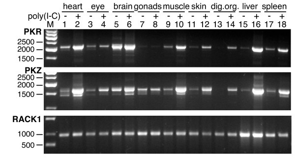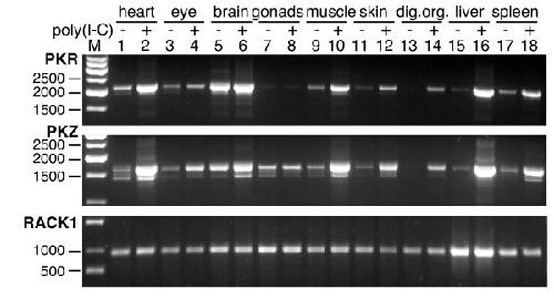 Figure 3. Comparison of expression patterns of zebrafish PKR and PKZ after induction with poly(I:C). PCRs were performed with cDNA prepared from the indicated tissues with primers covering the complete ORFs of zebrafish PKR (upper panel), PKZ (middle panel) or RACK1, the latter of which is constitutively expressed and served as control (lower panel). Zebrafish were either treated with poly(I:C) (indicated by plus) or with PBS (minus).