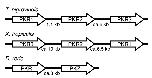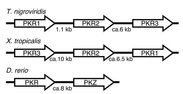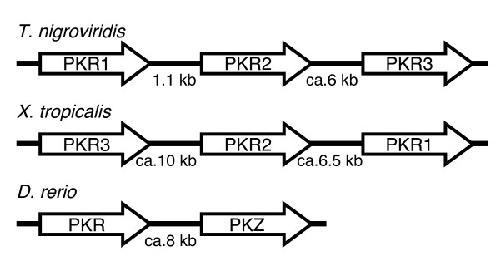 Figure 4. Genomic arrangement of tandemly arranged PKR and PKZ genes in T. nigroviridis, X. tropicalis and D. rerio. The genomic arrangement and relative orientation of three PKR genes in T. nigroviridis and X. tropicalis and PKR and PKZ in D. rerio are shown. Arrows indicate 5' to 3' orientation of genes. The distance or approximate sizes of intergenic regions are indicated.
