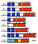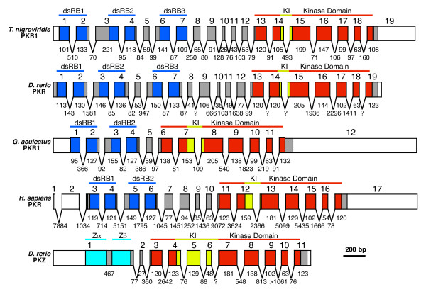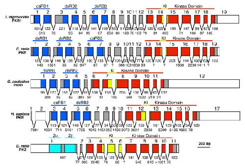 Figure 7. Exon/intron organization of PKR and PKZ genes. The exon/intron structure of T. nigroviridis PKR1, D. rerio PKR and PKZ, G. aculeatus PKR and H. sapiens PKR (as reported [47]). Untranslated regions of exons are represented as white boxes, while colored and gray boxes denote exons of ORFs. Exonic parts encoding dsRBDs (dark blue), Z-DNA binding domains (Zα; light blue), kinase domains (red) and KIs (yellow) are colored. Exons are drawn to scale. Lengths (in bp) of exonic parts contributing to the ORFs are shown below the exons. Lengths (in bp) of introns are shown in between exons. Question marks indicate intron sizes of unknown length.