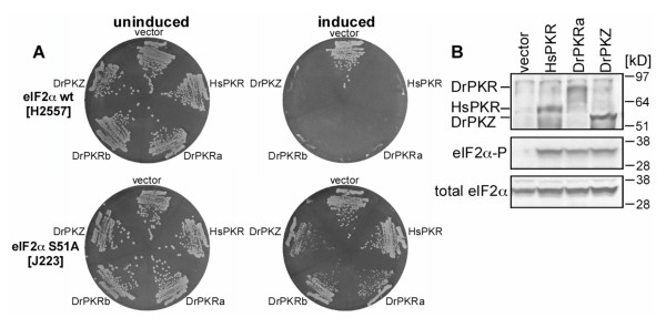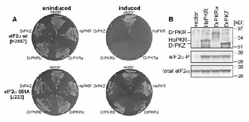 Figure 8. Both zebrafish PKR and PKZ phosphorylate yeast eIF2α. (A) Plasmids expressing full-length human (hs) PKR or zebrafish (dr) PKZ or two different alleles of PKR, under the control of a galactose-inducible promoter, were introduced into S. cerevisiae strains H2557 (wild-type eIF2α, upper plates) and J223 (eIF2α-S51A, lower plates) as indicated. After two rounds of single colony purification, the transformants were streaked out simultaneously on SD-ura (non-inducing conditions, left) or SGal-ura (inducing conditions, right) medium and grown for three days (SD-ura) or four days (SGal-ura). (B) Western blot analyses of extracts from strain H2557 transformed with vector, HsPKR, DrPKR or DrPKZ. SDS-PAGE was used to separate 4 μg of WCEs which were blotted onto nitrocellulose membranes. Tagged PKR and PKZ were detected using anti-Flag-tag antibody (upper panel). eIF2α phosphorylated on Ser51 and total eIF2α are shown in middle and bottom panels, respectively.
