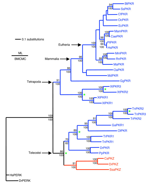 Figure 5. Phylogenetic relationship of PKR and PKZ genes. The phylogenetic tree was constructed from the kinase domains of PKR (blue branches) and PKZ (red branches), omitting the KI, using maximum likelihood and BMCMC approaches. Both analyses resulted in the same tree topology. Significant bootstrap values above 70 (for maximum likelihood analysis) and significant posterior probabilities converted to percentages above 95 (for Bayesian analysis) are shown above and below the branches, respectively. Asterisks denote evident duplication events. Human and zebrafish PERK were used as outgroups for rooting the phylogenetic tree. The following abbreviations were used: Bt, Bos taurus (cattle); Ss, Sus scrofa (pig); Cf, Canis familiaris (dog); Oc, Oryctolagus cuniculus (European rabbit); Ec, Equus caballus (horse); Mam, Macaca mulatta (Rhesus macaque); Cae, Chlorocebus aethiops (African green monkey); Pt, Pan troglodytes (chimpanzee); Hs, Homo sapiens (human); Mm, Mus musculus (house mouse); Rn, Rattus norvegicus (Norway rat); Ma, Mesocricetus auratus (golden hamster); Oa, Ornithorhynchus anatinus (platypus); Md, Monodelphis domestica (gray short-tailed opossum); Gg, Gallus gallus (chicken); Xt, Xenopus tropicalis (western clawed frog); Xl, Xenopus laevis (African clawed frog); Tn, Tetraodon nigroviridis (green spotted pufferfish); Tr, Takifugu rubripes (torafugu); Ga, Gasterosteus aculeatus (three spined stickleback); Ol, Oryzias latipes (Japanese medaka); Dr, Danio rerio (zebrafish); Pp, Pimephales promelas (fathead minnow); Ca, Carassius auratus (goldfish); Ssa, Salmo salar (Atlantic salmon).