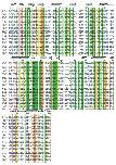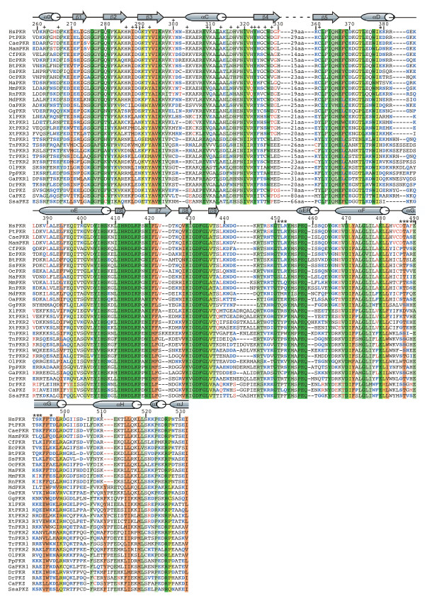 Figure 6. Multiple sequence alignment of the kinase domains of PKR and PKZ genes from various species. Multiple sequence alignment of the kinase domains PKR and PKZ from the indicated species (abbreviations are explained in Figure 5 legend) was performed using MUSCLE [64]. Secondary structure elements as reported for human PKR [10] as well as numbering of residues relative to human PKR are shown above the sequences. Residues involved in PKR inter-dimer contacts (pluses) and eIF2α recognition (asterisks) are marked above the sequences. Residues or deletions that show evidence for convergent evolution (blue) or are lineage specific (red) are colored. The backgrounds of residues that are highly conserved are colored as follows: 100% conservation, dark green; 90–99% conservation, light green; 80–89% conservation, yellow; conservation of functionally conserved residues, salmon pink.