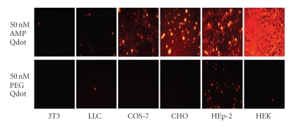 experiments employed AMP-coated qdots that were either unconjugated (upper row)